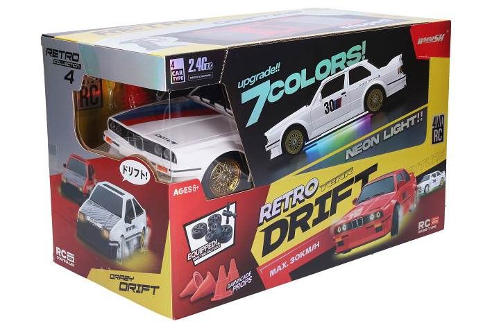 Auto Retro Drift RC na dálkové ovládání. Rozměry 27,5x12x9 cm. Frekvence 2. 4GHz. Pistolový ovladač. Rychlost 30 km/h. Světelné efekty. Bateriový pack 7. 4V 600mAh do auta součástí, 3xAAA do ovladače nejsou součástí. Obsah balení - nabíjecí USB kabel, 4 standardní kola, 4 drift kola, 4 kužely, šroubovák. Přepínač ON/OFF na spodní straně auta.