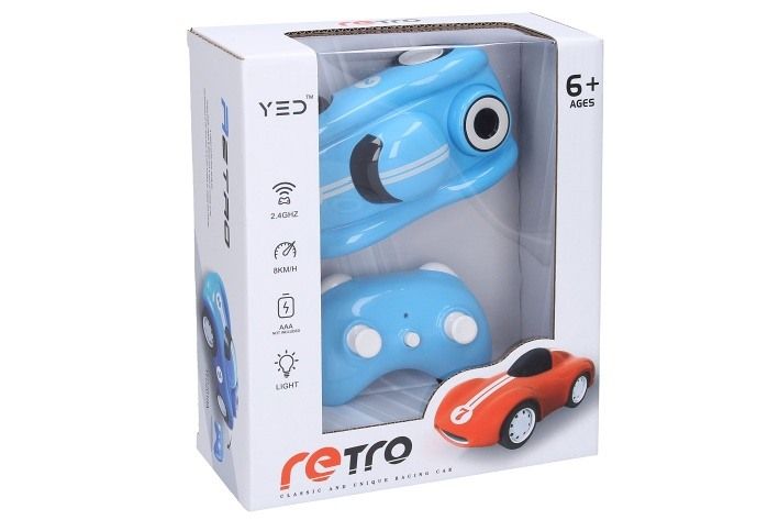 Auto retro závodní RC na dálkové ovládání. Rozměry 15,5x8,5x6,5 cm. Frekvence 2. 4GHz. Rychlost 8 km/h. Dosah až 25 m. Světelné efekty. 3xAAA baterie do auta, 2xAAA baterie do ovladače nejsou součástí. Tlačítko ON/OFF na ovladači, přepínač ON/OFF na spodní straně auta.