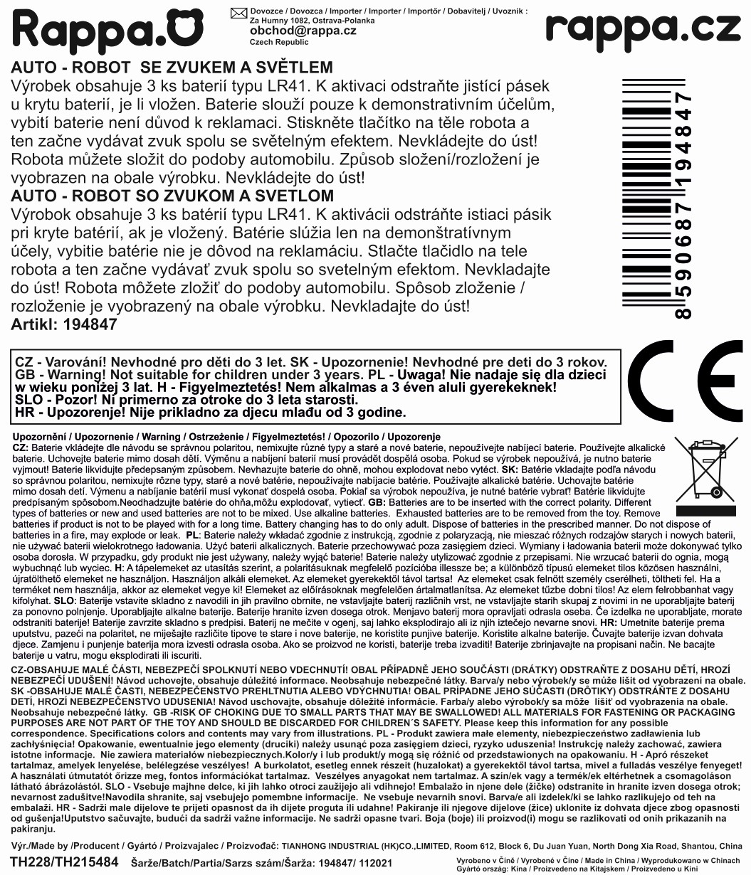 Moderní plastový autorobot CONVERSION se zvukovým a světelným efektem ti nesmí v pokojíčku chybět! Autorobot vyžaduje 3 ks baterií typu LR41/AG13, které jsou součástí balení. Stisknutím tlačítka na těle robota začne robot vydávat zvuk spolu se světelným efektem. A co ty? Máš už vlastního autorobota ve svém pokojíčku?