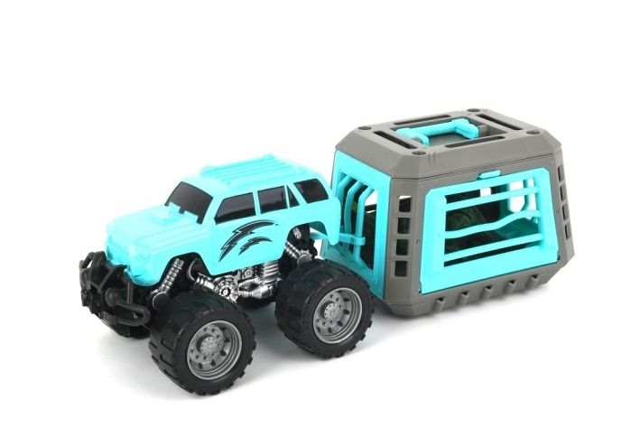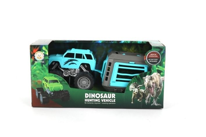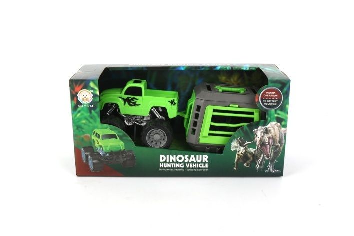 Hrací set obsahuje auto, klec pro dinosaura a dinosaura.