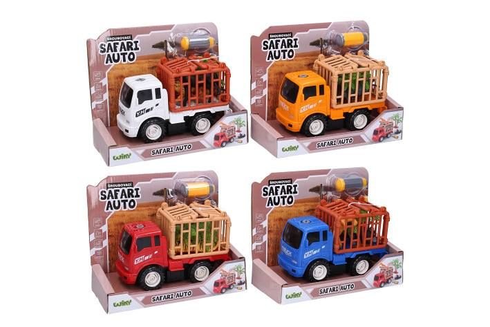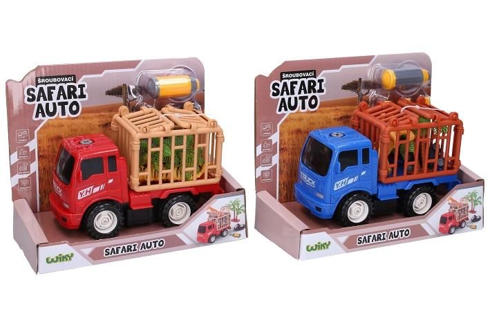 Auto safari šroubovací. Rozměry 16x10x6,5 cm. Součástí auto, šroubovák, 2 koncovky šroubováku, 2 figurky zvířátek, strom. Na setrvačník. 4 varianty - žlutá, modrá, červená, bílá.