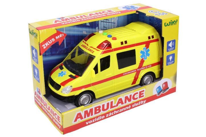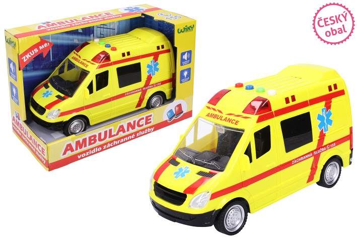 Záchranka v českém designu. Velikost 22 cm. Na setrvačník. Světelné a zvukové efekty. Aktivace tlačítky na střeše. 2xAA baterie součástí balení.