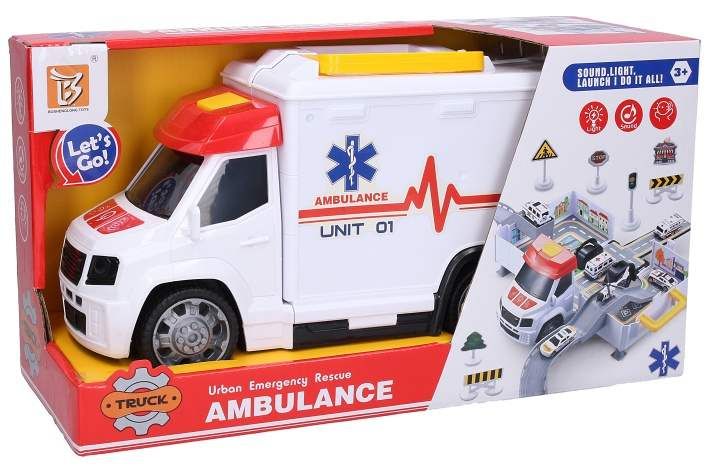 Auto sanitka garáž nemocnice. Rozměry sanitky 33,5x18x13 cm. Baterie 3xAG13, součástí balení. Vydává světelné a zvukové efekty. Aktivace tlačítky na kapotě. Sanitku je možné rozložit na garáž areál nemocnice, s autíčky a značkami. Volná kola. Velké tlačítko na střeše - odemčení sanitky.
