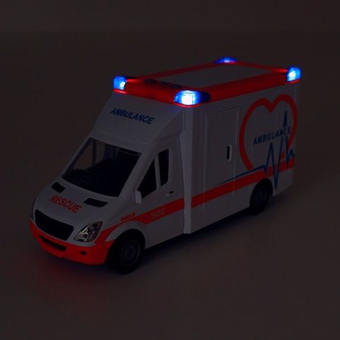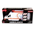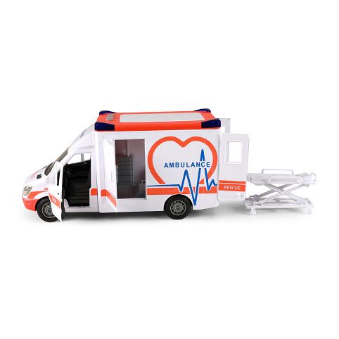 Auto sanitka s odnímatelnou střechou. Délka auta 27 cm, všechny dveře se dají otevřít. Světelné a zvukové efekty, které fungují po vložení 2xAA baterií, které nejsou součástí balení. Součástí sady jsou také nosítka.