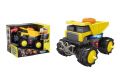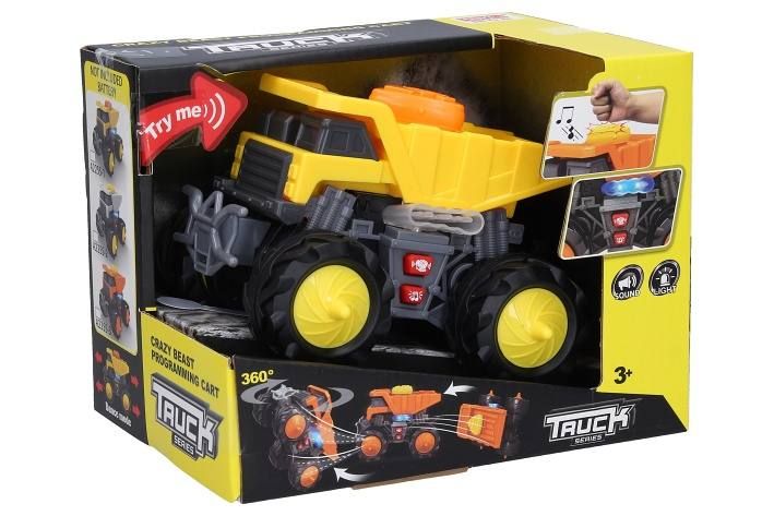Auto sklápěč s efekty. Rozměry 15,5x13,5x10,5 cm. Světelné, zvukové a pohybové efekty tlačítkem na nakládací ploše a postranními tlačítky (zvuk motoru, hudba, jízda dopředu, dozadu). 3xAAA baterie součástí.