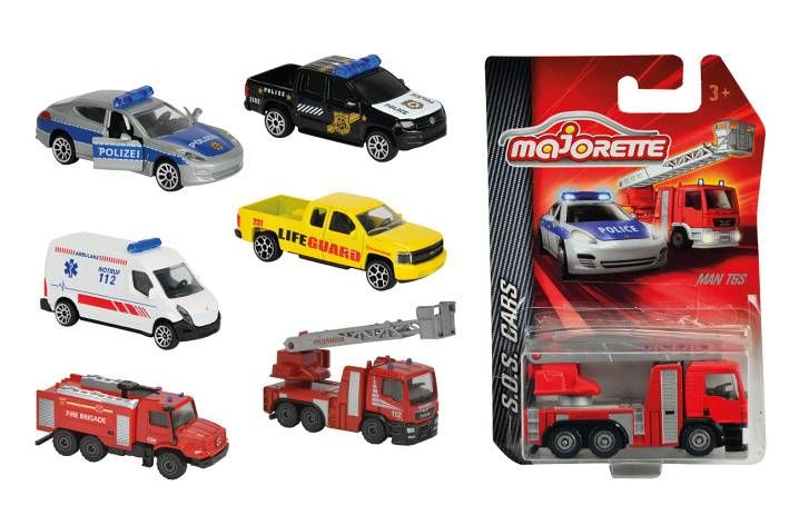 Kovové auto na volnoběh, mezinárodní verze. Pohyblivé a/nebo otevírací části. Délka 7,5 cm. 6 druhů: Chevrolet Silverado, hasičské auto MAN TGS nebo Mercedes-Benz Zetros, ambulance Renault, policejní auto VW Amarok nebo Porsche Panamera.