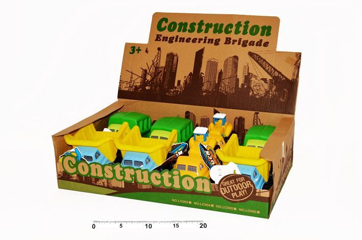 Stavební auto. Délka 16 cm. Display box - 8 ks. Volná kola. 3 varianty - sklápěč, odtahovka, popeláři.