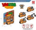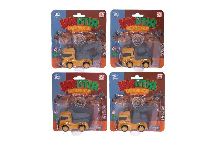 Auto stavební. Rozměry 8,5x5x5,5 cm. Na setrvačník. 4 varianty - sklápěč, domíchávač, jeřáb, bagr.