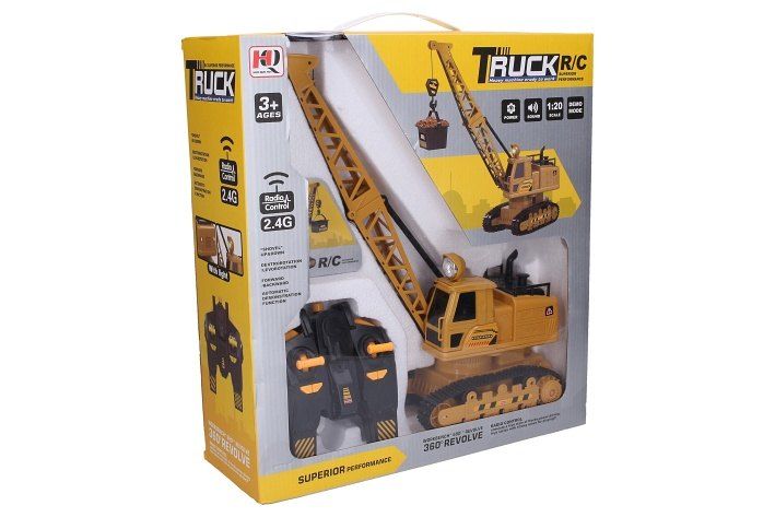 Auto stavební jeřáb RC na dálkové ovládání. Rozměry 30x11,5x36 cm. Frekvence 2.4 GHz. Světelné a zvukové efekty. Jeřáb bateriový pack 4.8V součástí, ovladač 3xAA baterie nejsou součástí. Součástí nabíjecí adaptér. Přepínač ON/OFF na spodní straně jeřábu. Ovladač - stisk jedné páčky - otáčení, stisk obou páček jízda dopředu či dozadu, levé přední tlačítko - vytažení háku, pravé přední tlačítko - spuštění háku, spodní tlačítka (pod páčkami) - otáčení základny, stlačení spodních tlačítek zaráz po dobu 2 vteřin - demo.