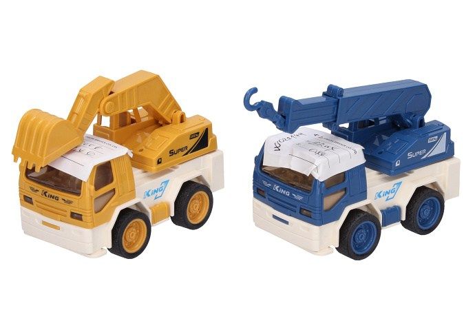 Auto stavební na setrvačník. Velikost 12 cm. Display box 12 ks. 2 varianty - jeřáb, bagr. Bagr - pohyblivé rameno s radlicí, jeřáb - vysunovací a pohyblivé rameno.