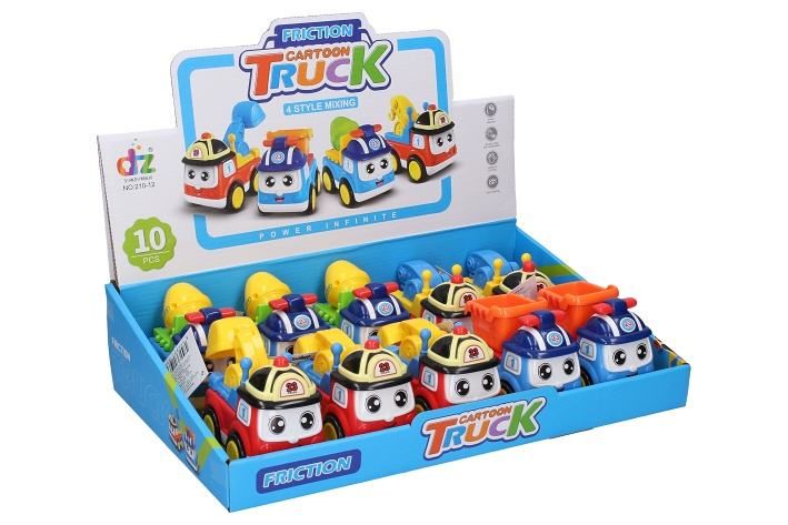 Auto stavební s obličejem. Rozměry auta 10,5 x 6,5 x 9 cm. Display box - 10 ks. Na setrvačník. 4 varianty - bagr, jeřáb, míchačka, sklápěč.