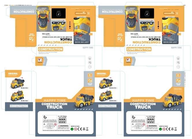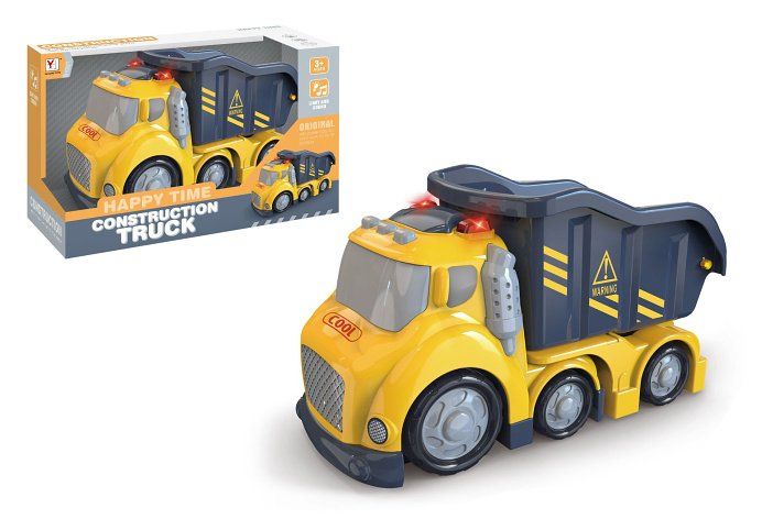 Auto stavební sklápěč. Vydává světelné a zvukové efekty. Baterie 3xAG13, součástí balení. Aktivace tlačítky na střeše (zvuk startování, zvuk troubení, zvuk couvání). Volná kola.