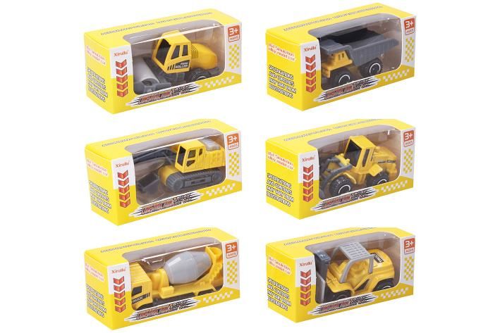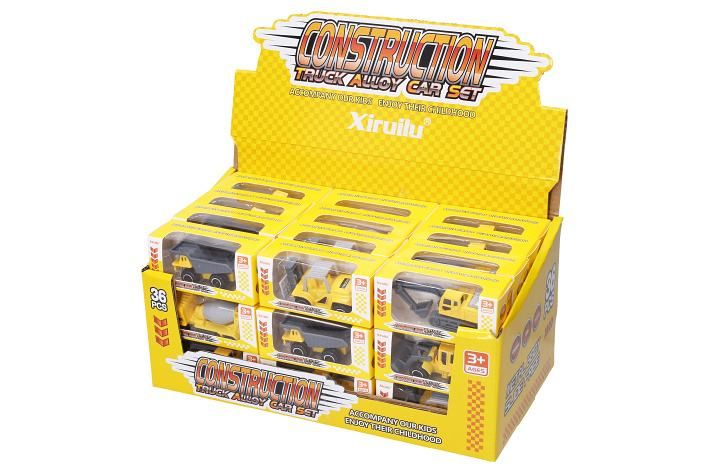 Auto stavební stroje. Velikost 8 cm. Vyrobeno z kovu. Volná kola. Display box 36 ks. 6 variant - sklápěč, buldozer, bagr, domíchávač, válec, vozík.