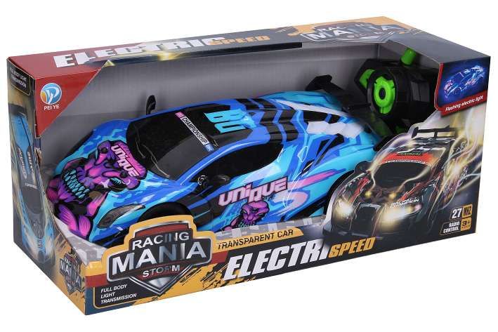Auto svítící RC na dálkové ovládání. Rozměry 27x12x8 cm. Frekvence 27 MHz. Pistolový ovladač. Světelné efekty celého auta. Baterie 4xAA do auta, 2xAA do ovladače (celkem 6xAA, nejsou součástí).