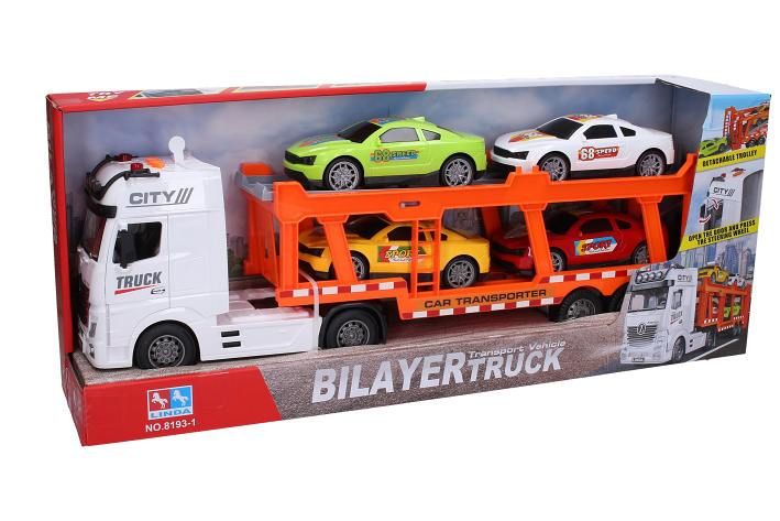 Auto tahač na setrvačník s auty set 4ks. Velikost tahače 56x10,5x20 cm. Vydává světelné a zvukové efekty. Obsah balení - tahač 56 cm na setrvačník, 4x auto 16 cm volná kola. Tahač - zvuk zvuk pohybu plošiny, zvuk couvání, zvuk motoru - aktivace tlačítky na střeše. Baterie 3xAG13 (LR44) 1,5V, součástí balení.