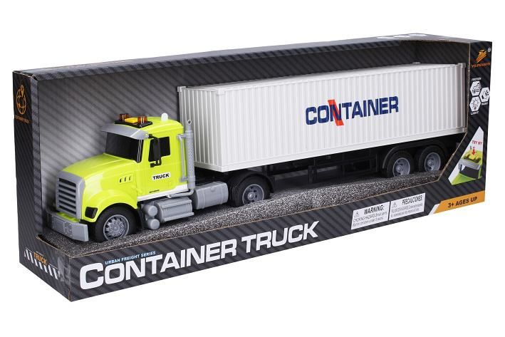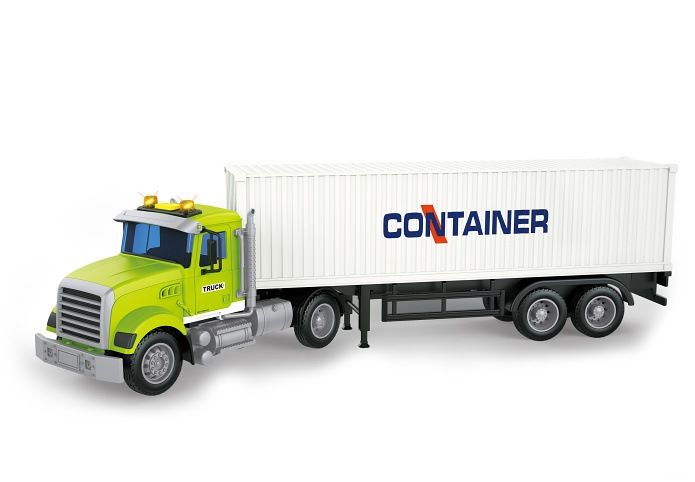 Auto tahač s kontejnerem na setrvačník s efekty. Velikost 48x9,5x14 cm. Vydává světelné a zvukové efekty. Aktivace tlačítkem na střeše. Opakovaný stisk přepíná efekty - zvuk motoru, zvuk sklápění, zvuk couvání, zvuk troubení. Baterie 3xAG13, součástí (1,5V). Otevíratelné dveře kontejneru, na setrvačník. Návěs je možné odpojit.