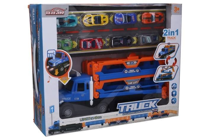 Auto tahač s vystřelovací dráhou na auta. Rozměry složeného tahače 34x9,5x18 cm. Délka vystřelovací dráhy v rozloženém stavu 140 cm. Tahač vydává světelné a zvukové efekty. Aktivace stiskem kapoty. 2xAA baterie, nejsou součástí balení. Součástí balení je 8 kovových autíček 6,5 cm, volná kola.