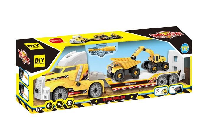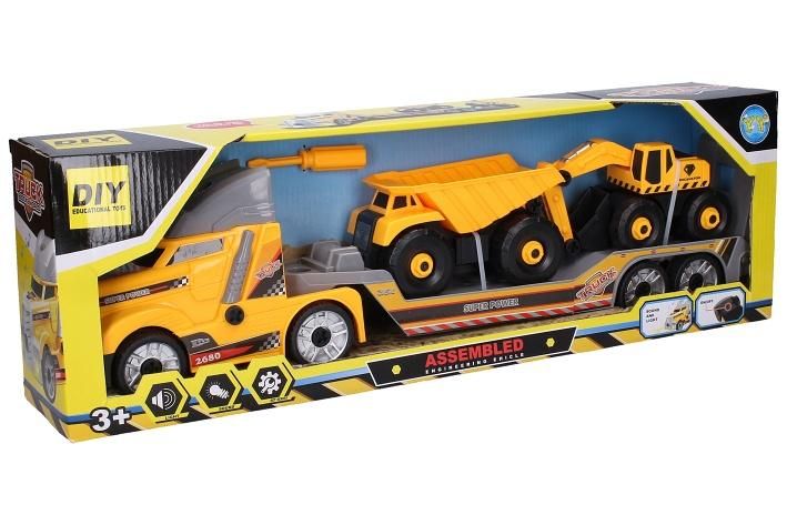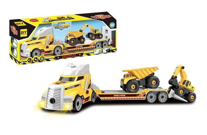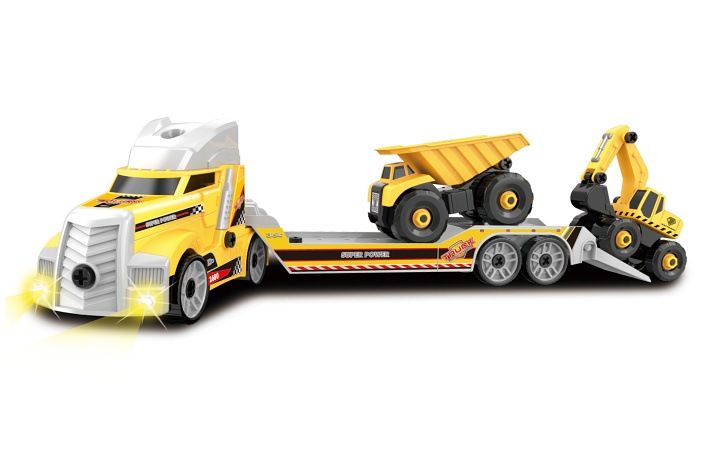 Rozměry tahače 62x10x15 cm. Volná kola. Balení obsahuje tahač a 2 stavební stroje 16 cm (sklápěč, bagr), křížový šroubovák (v rukojeti je klíč na matice). Vydává světelné a zvukové efekty. Aktivace efektů se provádí ON/OFF přepínačem na spodní straně tahače.