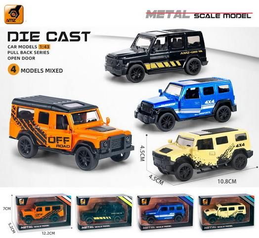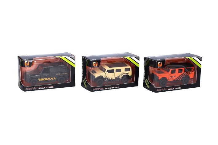 Auto terénní kovové. Rozměry 11x4,5x4,5 cm. Na zpětné natažení. Otevírací přední dveře. 4 varianty - oranžová, černá, modrá, žlutá.
