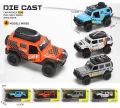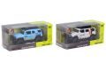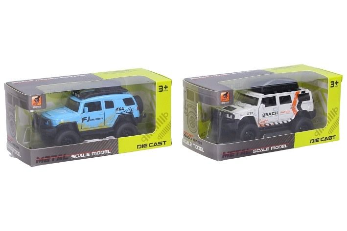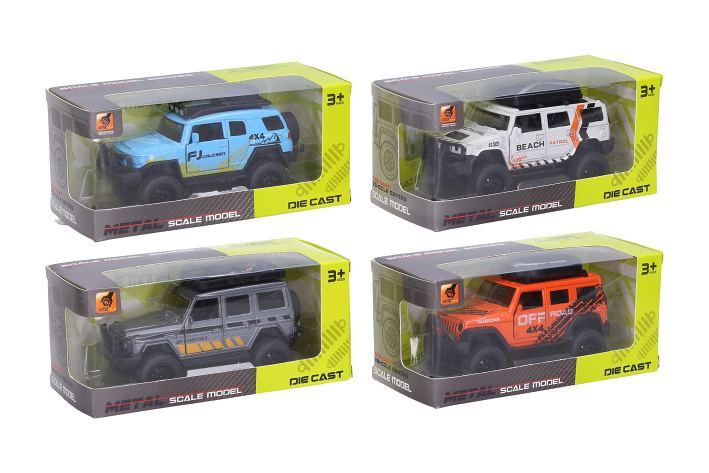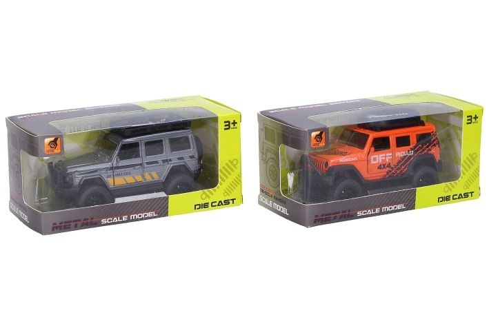 Auto terénní kovové. Rozměry 12x5,3x4,9 cm. Na zpětné natažení. Otevírací dveře. 4 varianty - oranžová, modrá, bílá, šedá.