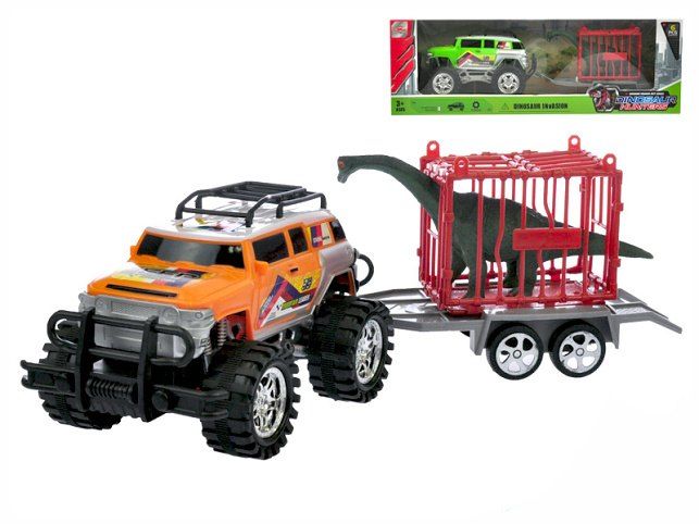 Toto terénní auto o velikosti 39cm s vozíkem potěší každého chlapečka. Auto je na setrvačník. Součástí vozíku je klec s dinosaurem. Skvělá hračka pro všechny kluky.