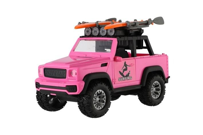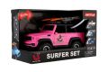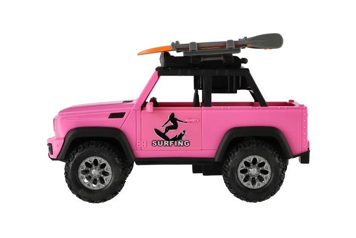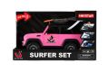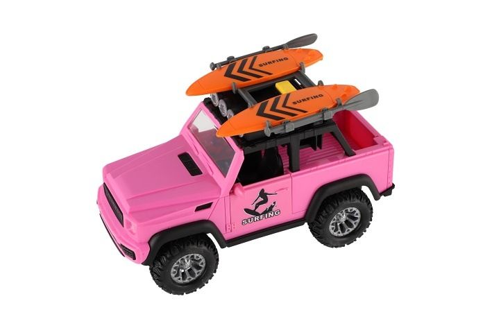 Model auta pro milovníky surfování a dobrodružství. Na střeše má 2 surfy a pádla. Svoji pozornost přitahuje díky růžové barvě a je velikosti 22 cm. Vůz má otevírací dveře a je na setrvačník. Baterie 3 x AG13 jsou součástí výrobku.