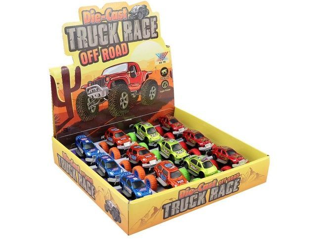 Auto truck, 12 ks v boxu, 8 cm. Užijte si jízdu s vozem na velkých kolech a vyberte si jednu ze čtyř barevných variant. Hračka je určena pro děti 3+. Rozměr hračky je 8 x 5,5 x 5,5 cm. Materiál hračky je plast. Balení hračky je display box. Produkt je určený pro kluky.