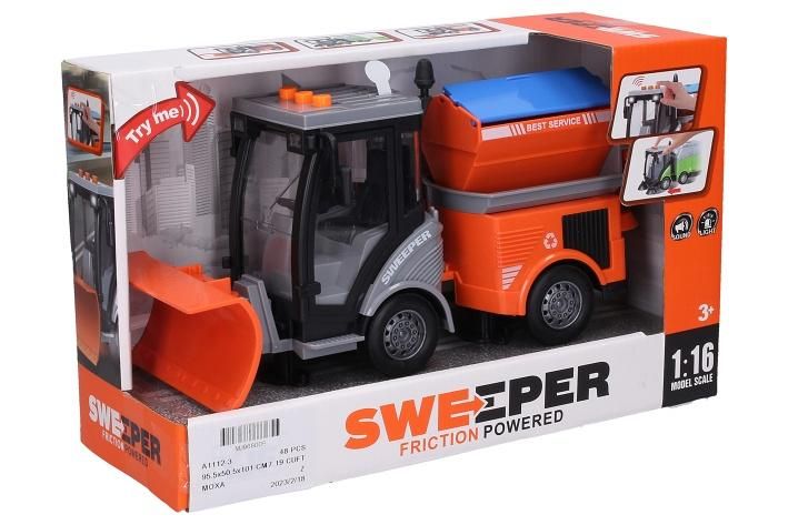 Auto úklidové s efekty. Velikost 28 cm. Na setrvačník. Světelné a zvukové efekty tlačítky na kabině auta (startování, troubení, couvání). 3xAG13 baterie součástí.