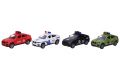 Auto záchranné. Rozměry 13x6x6 cm. Na setrvačník. Otevírací dveře a kufr. 12 ks display box. 4 varianty - hasiči, vojenské, policie-swat, policie-bílé.
