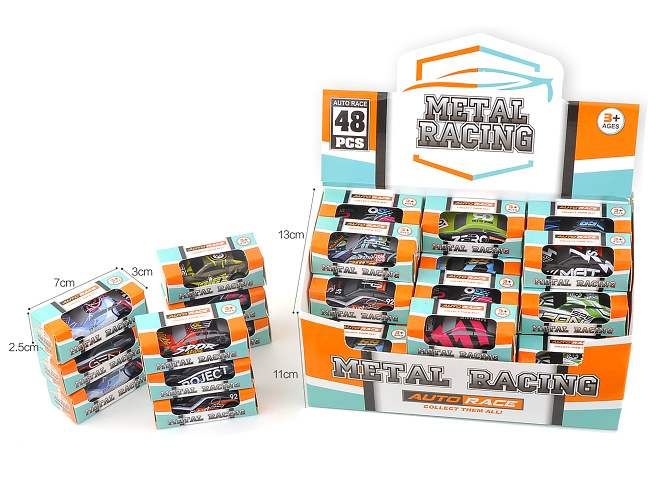 Auto závodní, volná kola. Rozměry 6,8x3x2 cm. Display box48 ks.