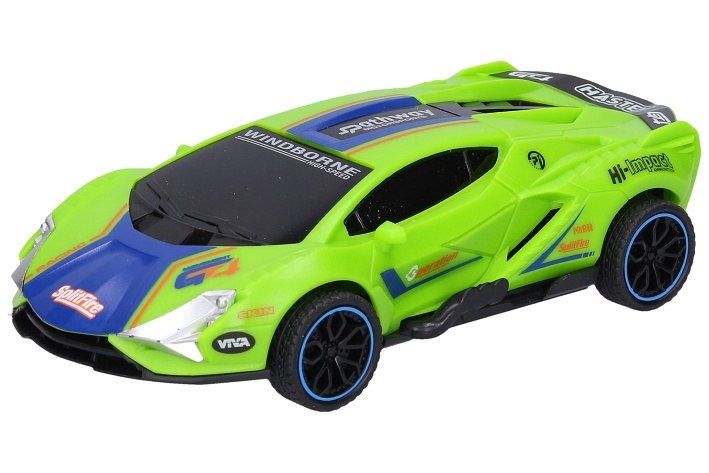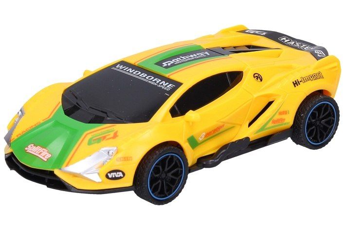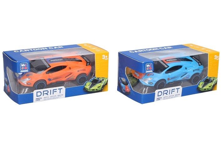 Auto závodní driftující. Rozměry 15,5x8x4 cm. Rozjetím auta dopředu samo driftuje (smykuje) - uprostřed podvozku je kolmé kolečko. Na setrvačník. 4 varianty - modré, zelené, oranžové, žluté.