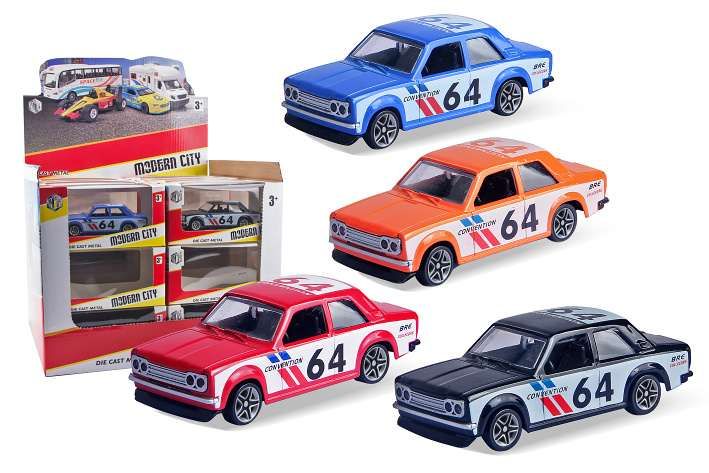 Auto závodní kovové, volná kola. Rozměry 10x4,5x4,5 cm. Display box - 24 ks. 4 varianty - modrá, oranžová, červená, černá.