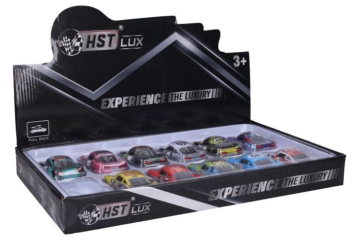 Auto závodní kovové na zpětné natažení. Velikost 10 cm. Display box - 12 ks. Různé barevné varianty.