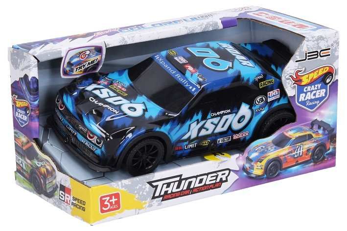 Auto závodní s efekty. Rozměry 19,5x8,5x5,5 cm. Na setrvačník. Světelné a zvukové efekty stiskem přední kapoty. 4xAG13 baterie součástí.