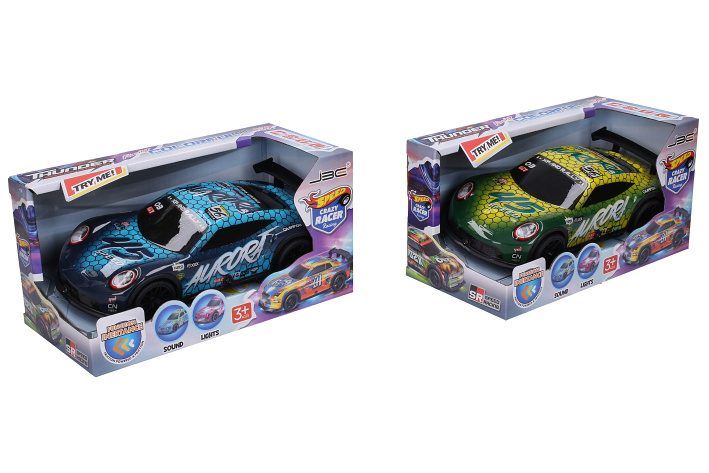 Auto závodní s efekty. Rozměry 20x8,5x6 cm. Vydává světelné a zvukové efekty. Aktivace zatlačením na kapotu. Na setrvačník. 4xAG13/LR44 1,5V, součástí balení. 2 varianty - zelená, modrá.