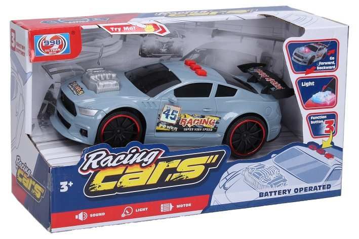 Auto závodní s efekty. Velikost 21 cm. Vydává světelné a zvukové efekty. Aktivace tlačítky na střeše. Levé tlačítko - zvuk motoru, pohyb dopředu a po krátké pauze pohyb dozadu. Prostřední tlačítko - zvuk troubení. Pravé tlačítko - hudba. Baterie 3xAA (1,5V), nejsou součástí.
