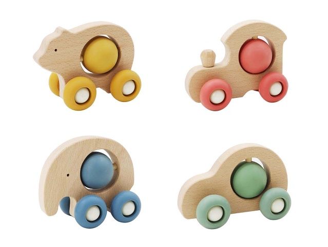 Auto zvířátko s kuličkou dřevěné. 4 varianty - medvěd, slon, mašinka, auto.