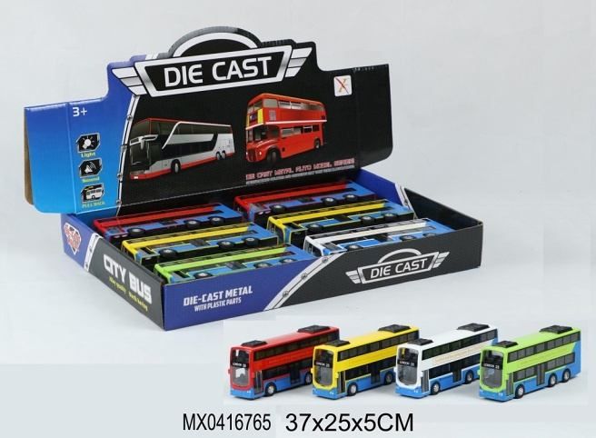 Autobus má světelný a zvukový efekt. Funkce pull back – natáhni a jeď. Na baterie: 3x LR44 (jsou součástí balení)