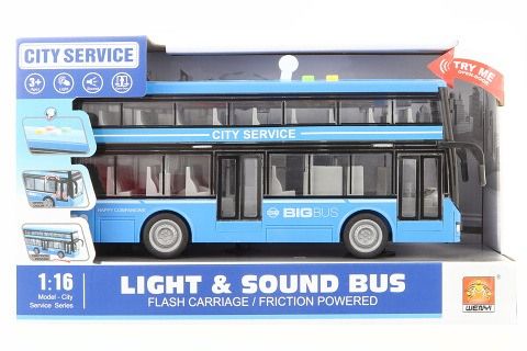 Plastový dvoupatrový autobus na baterie. Autobus vydává zvuky. Rozměry cca 28,3 x 7,3 x 12 cm. Napájení na 3 AG13 baterie (jsou součástí). Rozměry balení cca 32 x 11,5 x 18,5 cm. Věk 3+