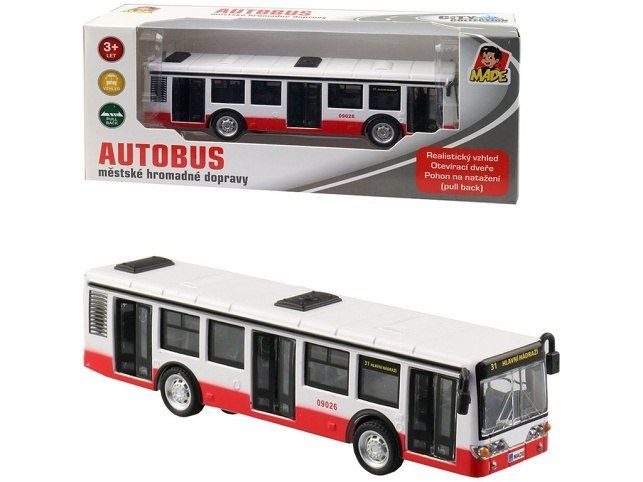 Kovový autobus s realistickým vzhledem v českém designu. Skvělý dárek pro všechny příznivce městských dopravních prostředků. Červenobíločernou barevnou kombinaci můžete vidět na prostředcích městské hromadné dopravy v některých našich městech. Autobus má otevírací dveře. Pohon je na zpětné natažení. Rozměry autobusu jsou cca 16 x 3 x 3 cm. Materiál kombinace kovu a plastu. Vhodné pro děti od 3 let