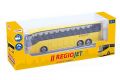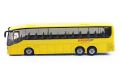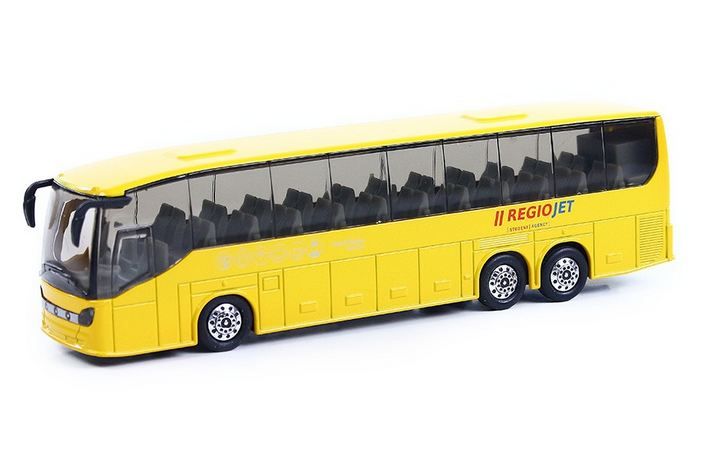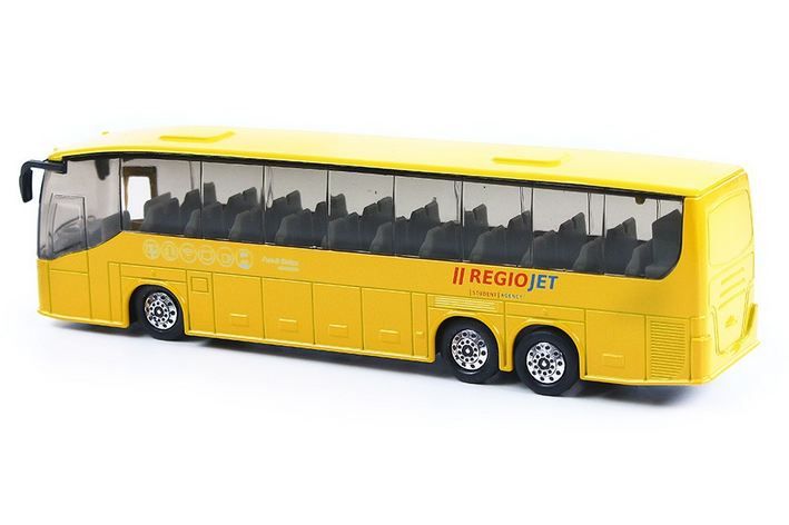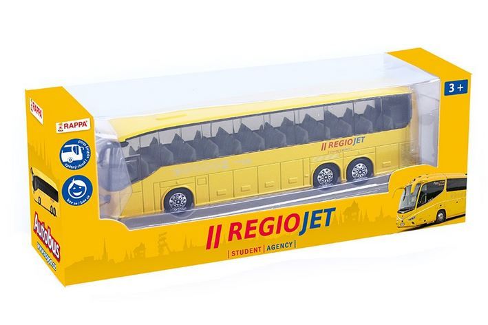 Originální žlutý autobus RegioJet od Student Agency. Autobus jezdí na zpětný chod, má kovové tělo s plastovými prvky a jeho délka je 18,5 cm.