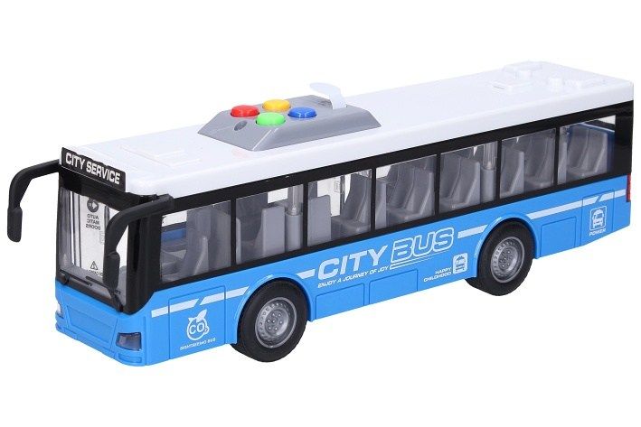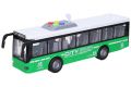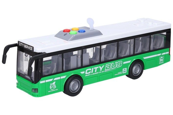 Autobus s efekty. Rozměry 27x8x9 cm. Na setrvačník. Otevírací dveře. Světelné a zvukové efekty. 3xAG13 baterie součástí. 3 varianty - zelená, modrá, červená.