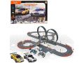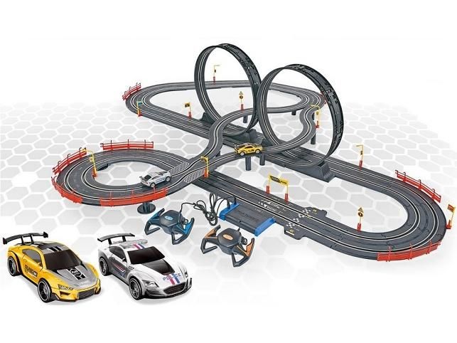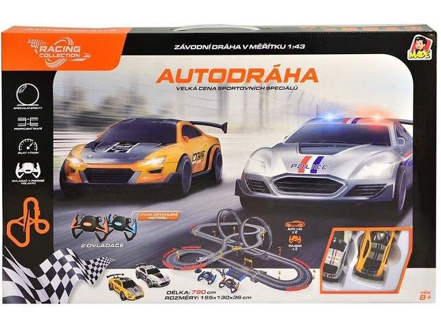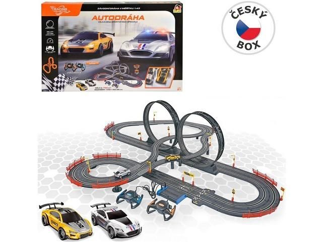 Autodráha z produktové řady Racing Collection obsahuje 2 auta, 2 ovladače, lopingy s mostem a s příslušenstvím, délka trati 790 cm. Spousta zábavy pro celou rodinu v jedné krabici. Celkový zážitek ze hry umocní realistické zvuky a světelné efekty. Jednoduchá manipulace a celkově snadná montáž. Sestavte a můžete začít. Kdo bude nejrychlejším závodníkem? Rozměry: 155 x 130 x 36 cm Napájení: 8 x 1,5V AA (baterie nejsou součástí balení). Materiál: plast, kovDoporučený věk: 8 +