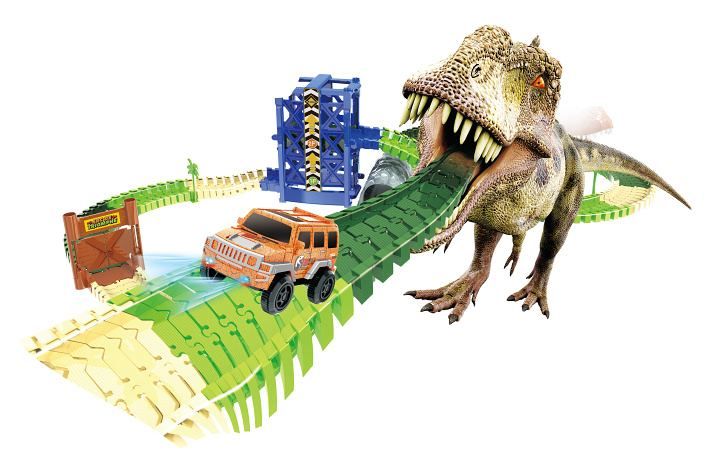 Autodráha Dino park s výtahem 1 auto. Rozměry auta 9,5x5x4,5 cm. Délka trati 240 cm. Kromě dráhy a 1 auta balení obsahuje výtah, bránu, jeskyni a průjezd tlamou T-rexe. Obsahuje 175 dílů.