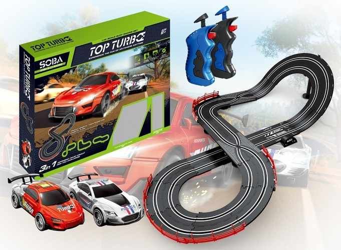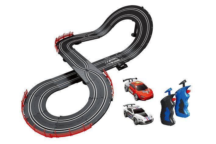 Autodráha policie a zloděj. Délka trati je 340 cm. Rozměry trati ve složeném stavu jsou 120 x 70 x 20 cm. Balení obsahuje 2 autíčka, 10 cm, se svítícími světly. Návod v balení. Napájení, 12V adaptér.