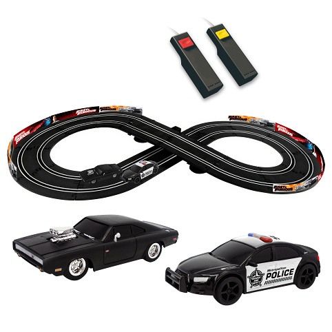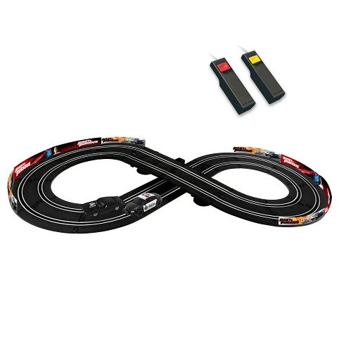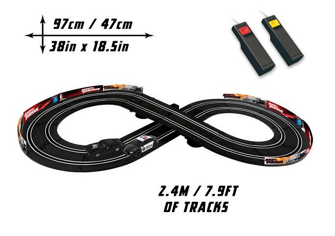 Autodráha smyčka Rychle a zběsile. Délka trati 2,4 m. Rozměry 97x47 cm. Součástí 2 auta. 2xAA baterie do každého z ovladačů nejsou součástí. Návod na sestavení součástí.