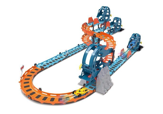 Autodráha Tumbling Track. Rozměry složené trati 125x42x26 cm. Délka trati 470 cm. Auto je oboustranné. Auto jezdí na konec dráhy a zpět. Obsahuje 80 dílků, 1 oboustranné auto. Světelné efekty auta, světelné a zvukové efekty tunelu. Auto bateriový pack 3. 7V součástí, skalní tunel 3xAA baterie nejsou součástí. Tlačítko ON/OFF na tunelu a autě (povytažení nárazníku). USB kabel součástí. Obrázkový návod na sestavení na zadní straně obalu.