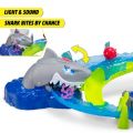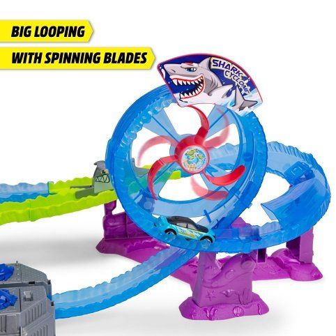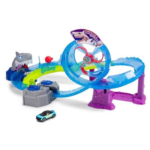 Autodráha White Shark o délce 80 cm. Motorizovaná žraločí dráha se smyčkou. Světelná i zvuková funkce - hrozivé podvodní zvuky, světelné efekty a žraločí řev. Auta se plnou rychlostí řítí smyčkou, přejíždějí vodní tunel nebo přistávají přímo u velkého bí