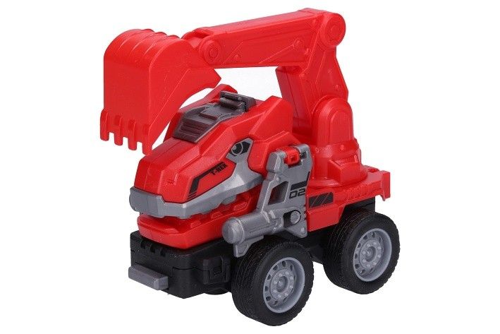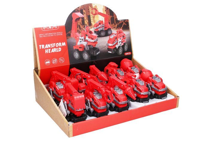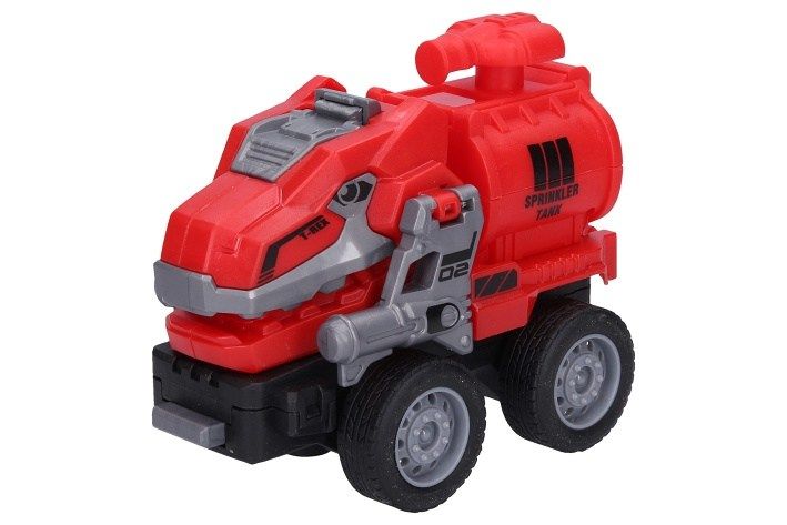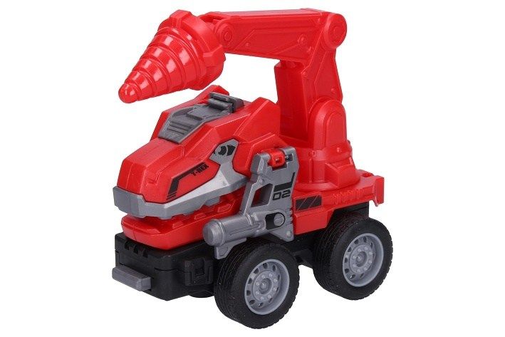 Autorobot dino hasičské. Délka 11 cm. Na setrvačník. Display box 10 ks. 5 variant - vrták, bagr, drapák, domíchávač, cisterna.