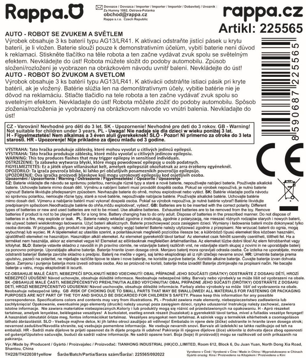 Moderní plastový autorobot se zvukovým a světelným efektem ti nesmí v pokojíčku chybět! Autorobot vyžaduje 3 ks baterií typu LR41, které jsou součástí balení. Stisknutím tlačítka na těle robota začne robot vydávat zvuk spolu se světelným efektem. Robot se můžete skládat a rozkládat dle vloženého návodu. Stačí si vybrat! A co ty? Máš už vlastního autorobota ve svém pokojíčku?